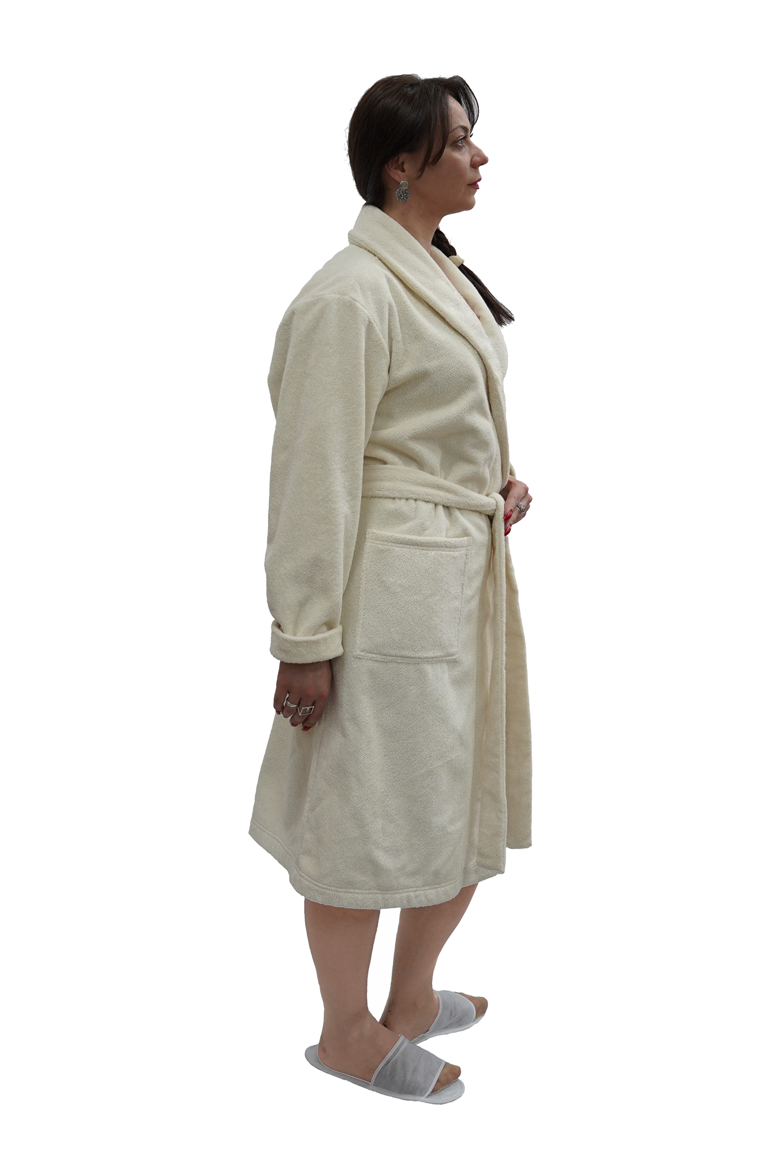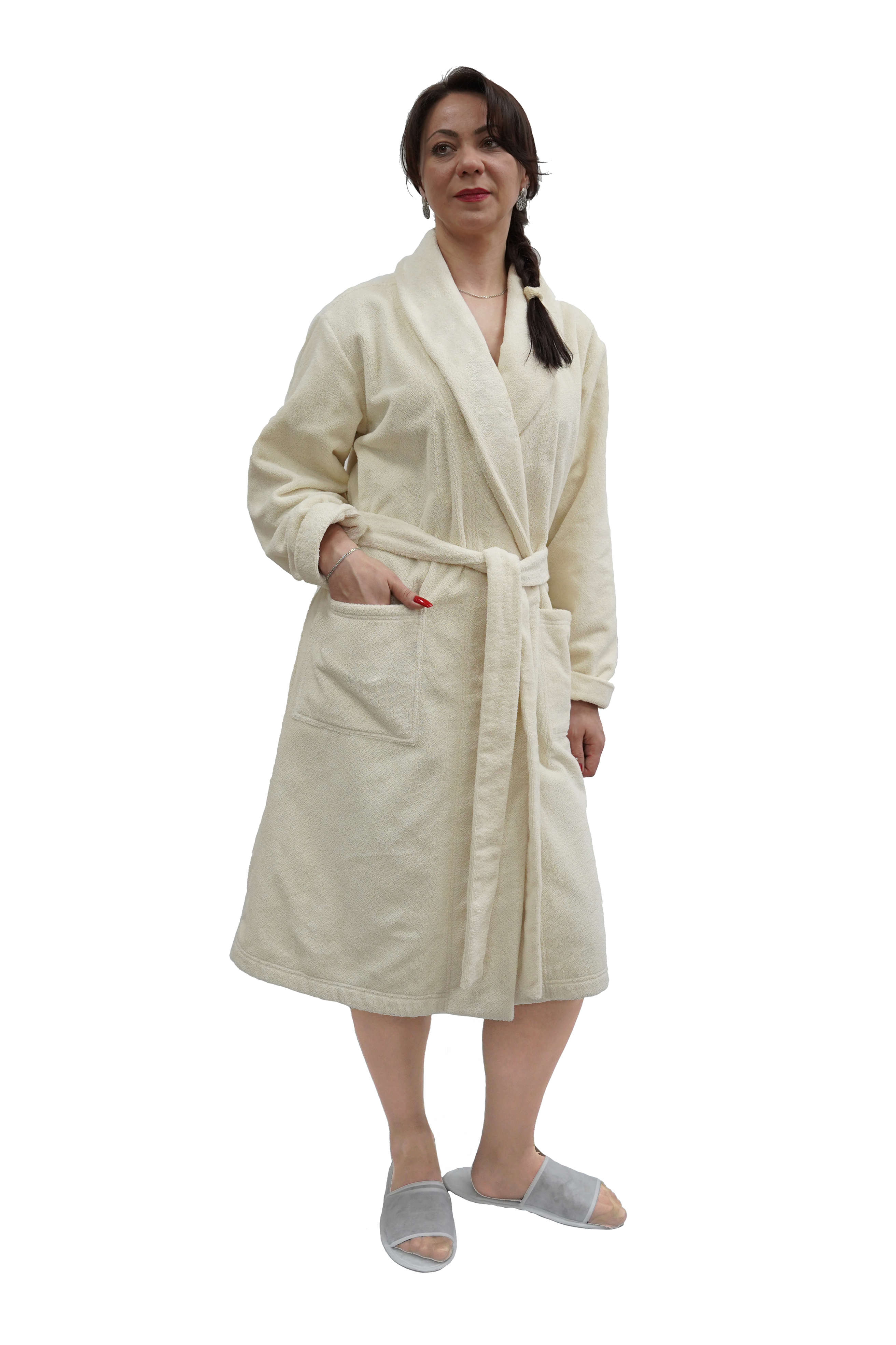 Халат женский махровый прямого силуэта, на запах, по талии завязывается на пояс, с боковыми накладными карманами. Воротник-апаж.