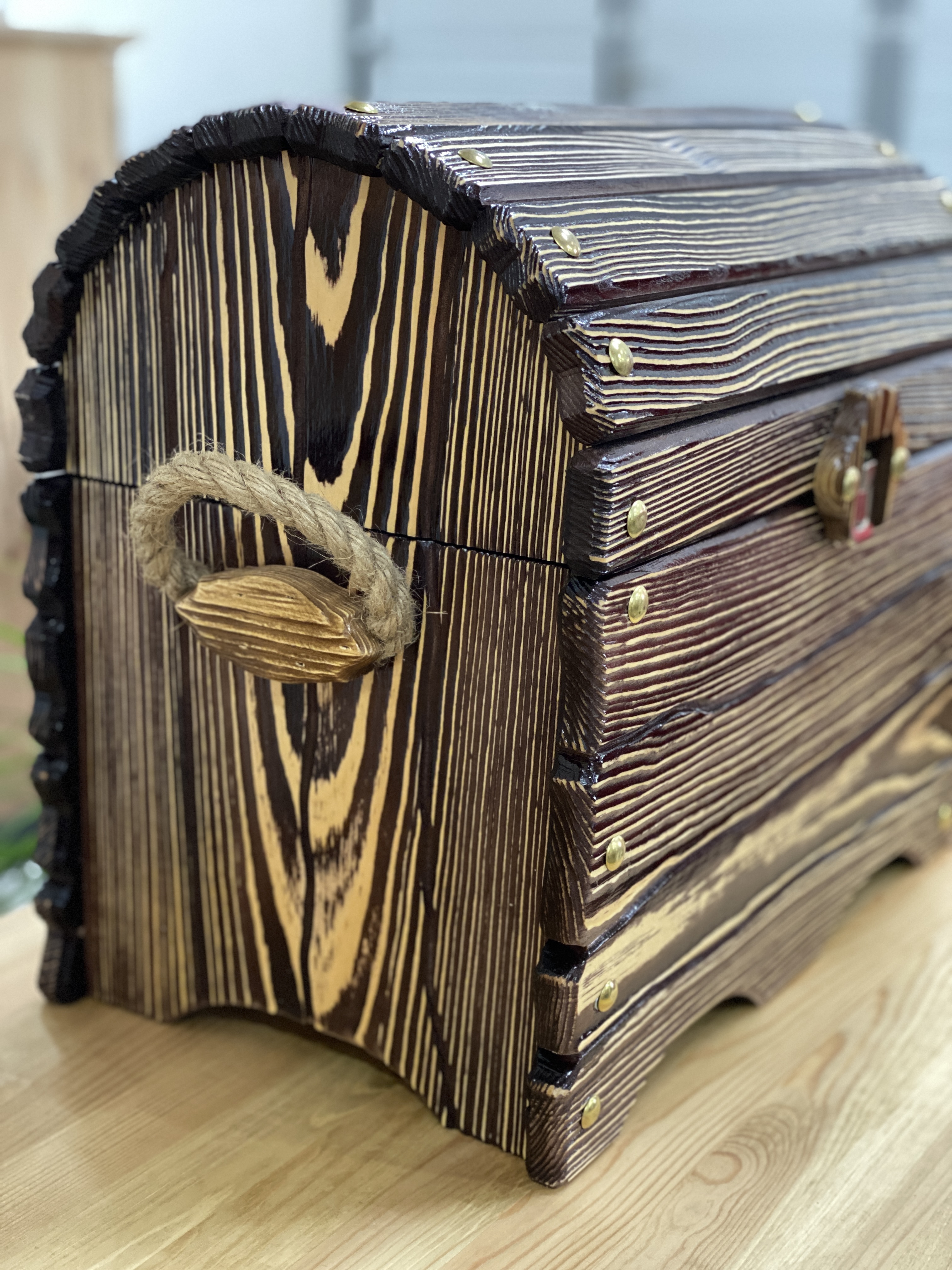 Ларец изготовлен из древесины лиственных пород с декоративными гвоздиками, для удобства переноски предусмотрены с обеих сторон ручки, изготовленные из каната джутового. Ларец имеет защитно-декоративное покрытие, выполненное из различного рода пропиток и лаков. Имеется деревянный замок для удобства использования.