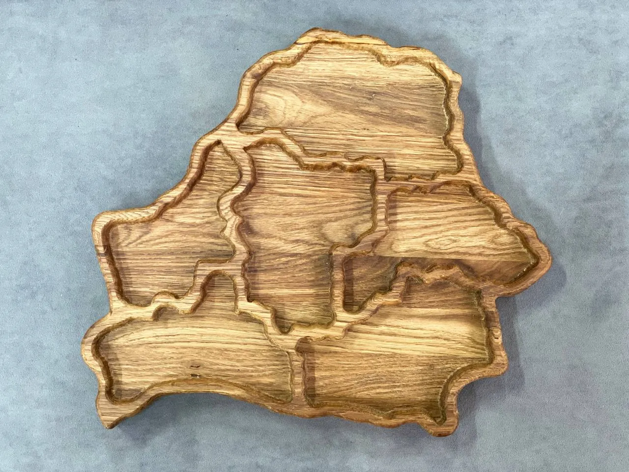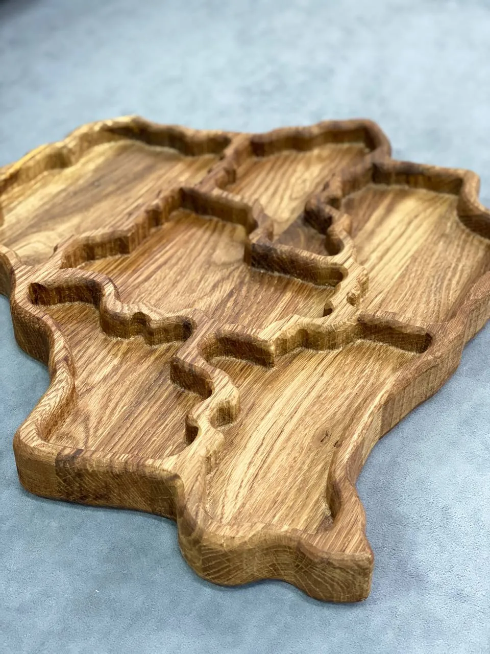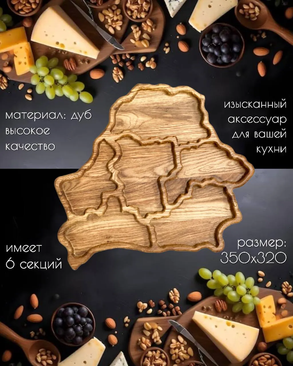 Менажница выполнена исключительно из экологически чистых материалов. Выполнена из дуба и пропитана натуральными маслами и воском, защищающими от влаги и плесени.