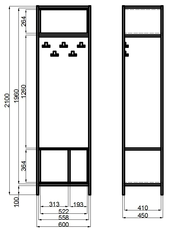 Секция оснащается 5-ю крючками двухрожковыми для верхней одежды